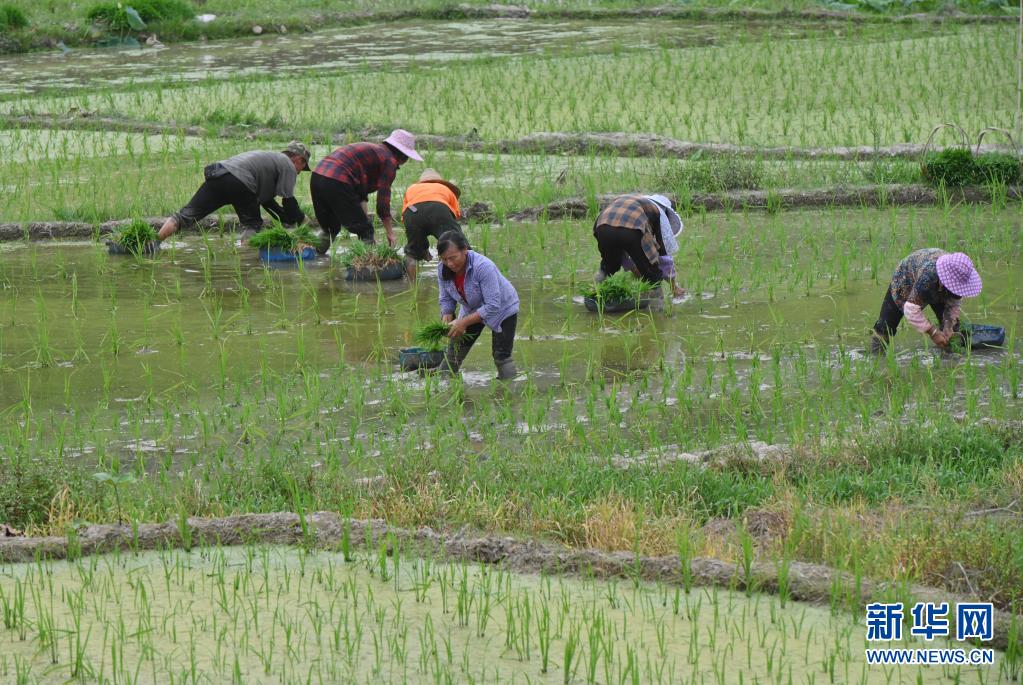 6月19日,建宁县濉溪镇圳头村村民在田里插秧。