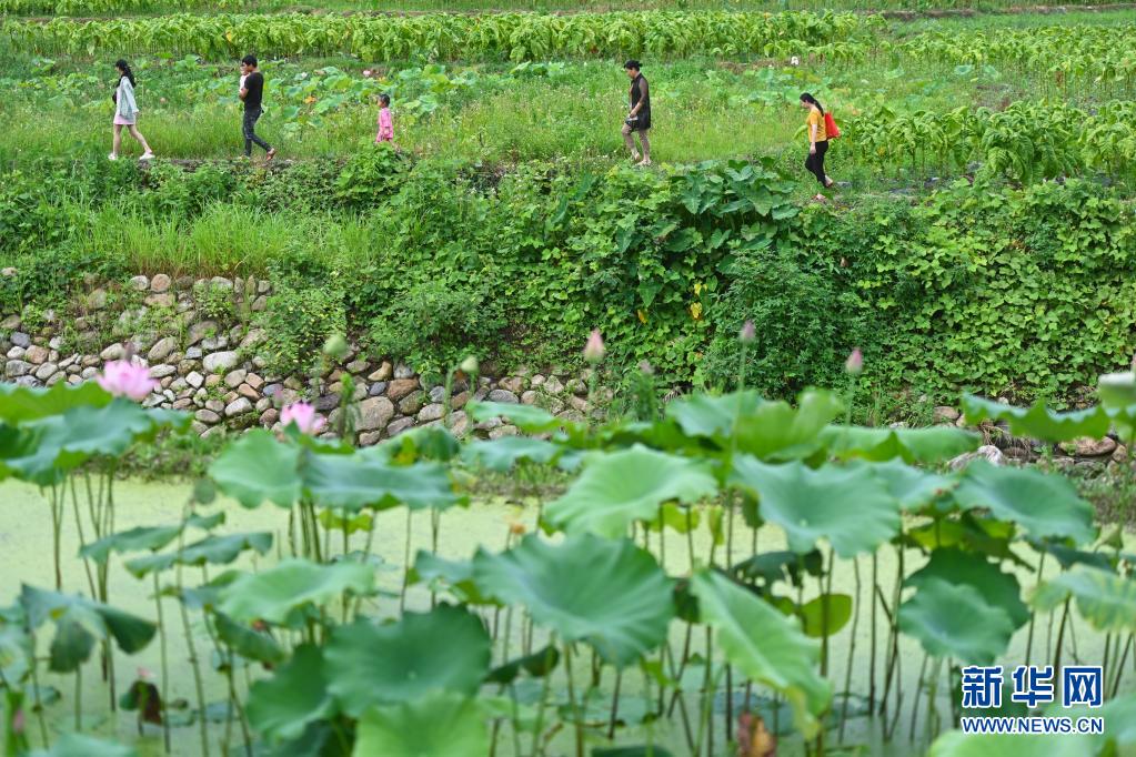 6月20日,游客在建宁县濉溪镇大源村莲田游览。