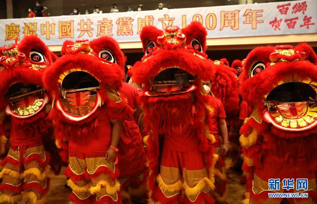 今年7月1日,中国共产党将迎来成立一百周年,同时也是香港回归祖国24周年的日子。为庆祝这一盛事,100个地区社团派出300多名香港青年舞动100只红黄配色的醒狮,多天来穿梭于香港各地区的标志性建筑,最终于20日当天汇聚起来,拼出“100”字样以及中华人民共和国国旗图案。