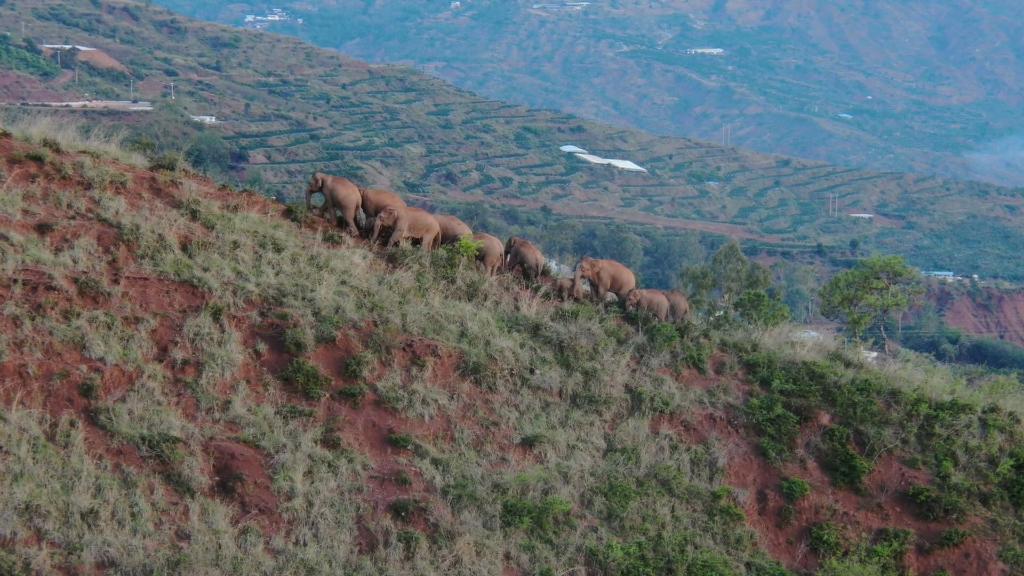 ↑6月20日在玉溪市峨山县大龙潭乡拍摄的象群(无人机视频截图)。云南省森林消防总队供图