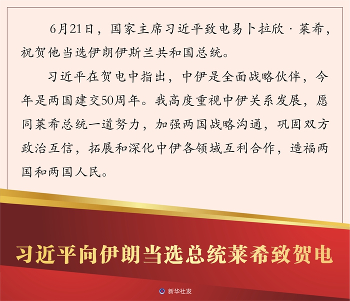 新华社北京6月21日电 6月21日,国家主席习近平致电易卜拉欣·莱希,祝贺他当选伊朗伊斯兰共和国总统。