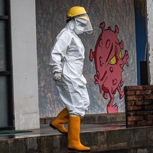 6月21日,在印度尼西亚南唐格朗,一名医务人员经过一处冠状病毒涂鸦墙。新华社发(阿贡 摄)