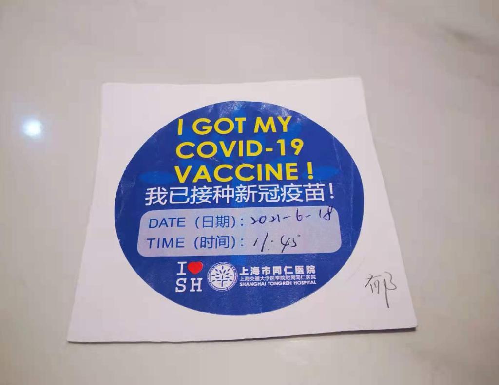新华社上海6月22日电(记者潘清)一张蓝色的圆形小纸片,印有“上海市同仁医院”,以及中英双语“我已接种新冠疫苗!(I got my COVID-19 Vaccine!)”字样。此外,还有手写日期和时间:“2021年6月18日,11时45分”。