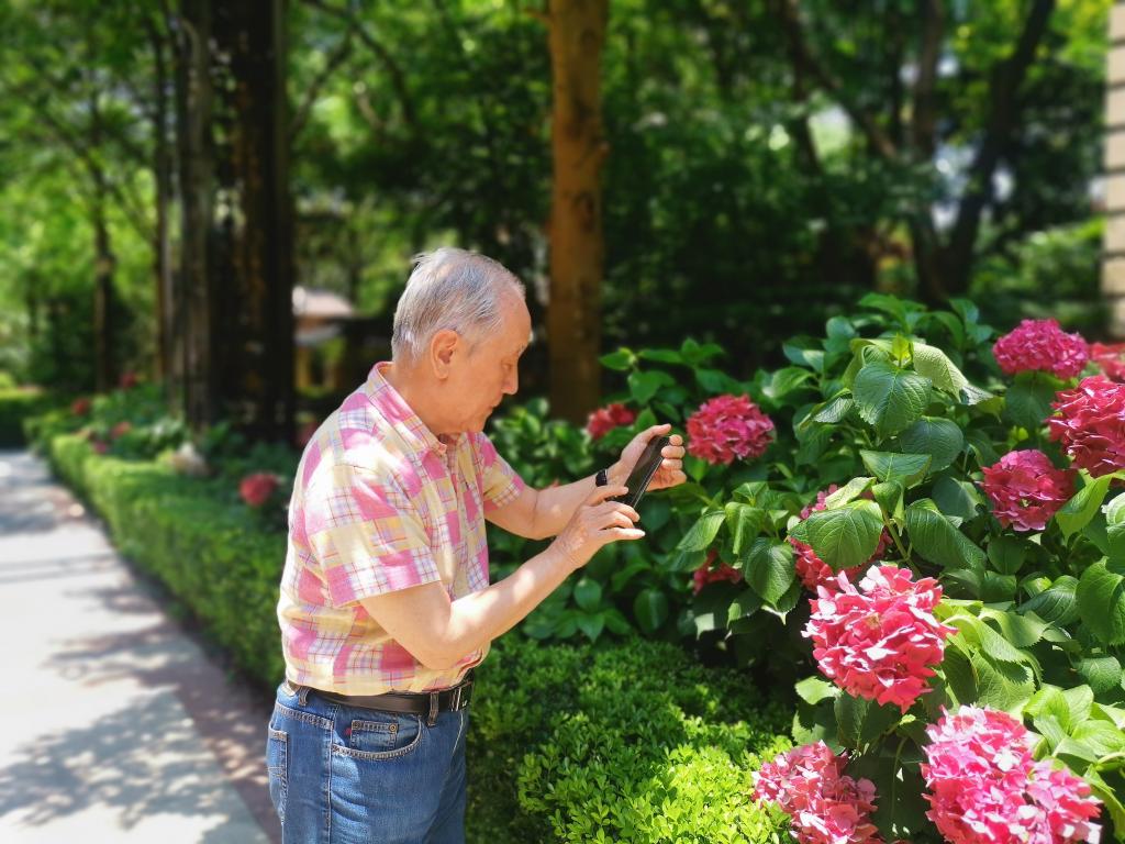 6月22日,郁慕明在上海居所花园中散步,并饶有兴致地拍摄盛开的花卉。新华社记者 潘清 摄