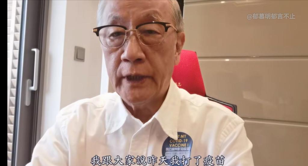 6月19日,八旬高龄的台湾知名人士、新党前主席郁慕明胸前贴着这张小纸片,通过其在大陆社交平台“今日头条”账号“郁慕明郁言不止”,以视频的方式称“昨天我打了疫苗”。