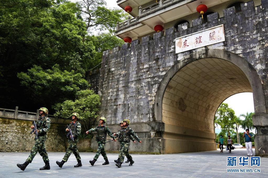 武警广西总队崇左支队执勤大队凭祥中队官兵在友谊关景区内巡逻执勤(2019年7月25日摄)。新华社发(余海洋 摄)