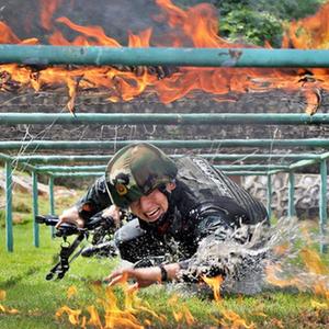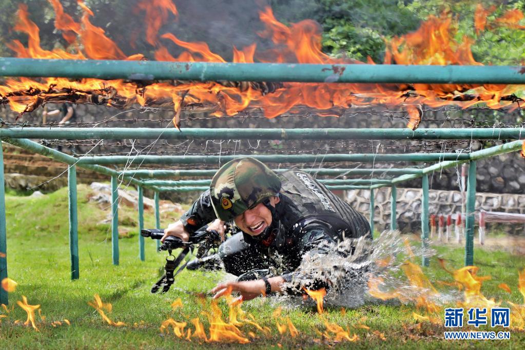 武警广西总队崇左支队执勤大队凭祥中队官兵进行穿越火障训练(2019年8月6日摄)。新华社发(余海洋 摄)
