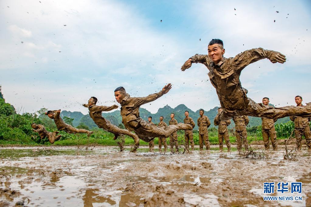 武警广西总队崇左支队执勤大队凭祥中队官兵在泥潭中进行倒功训练(2020年5月6日摄)。新华社发(余海洋 摄)
