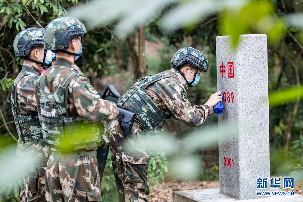 武警广西总队崇左支队执勤大队凭祥中队官兵在界碑处执勤时擦拭界碑(1月28日摄)。新华社发(余海洋 摄)