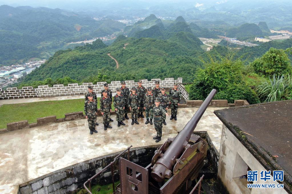 武警广西总队崇左支队执勤大队凭祥中队官兵在镇南关古炮台遗址组织教育活动(2019年8月5日摄,无人机照片)。新华社发(余海洋 摄)