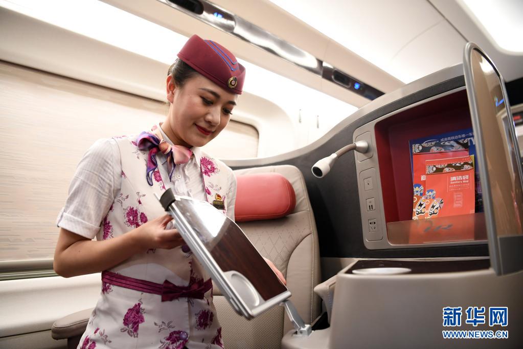 6月23日,乘务人员在CR400AF复兴号智能动车组车厢内进行设备功能展示。