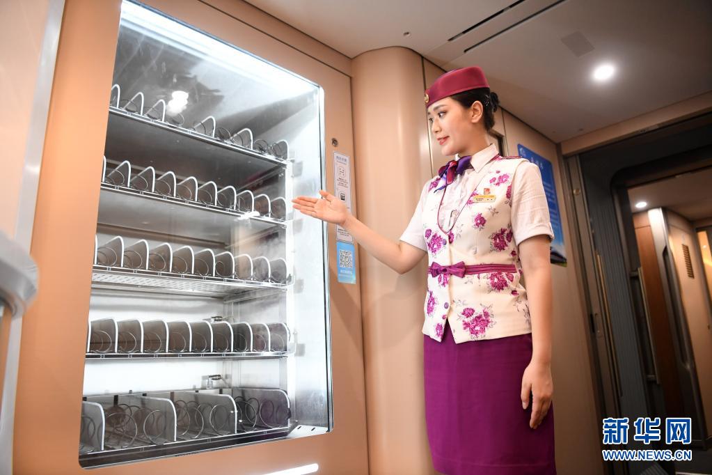 6月23日,乘务人员在CR400AF复兴号智能动车组车厢内进行设备功能展示。