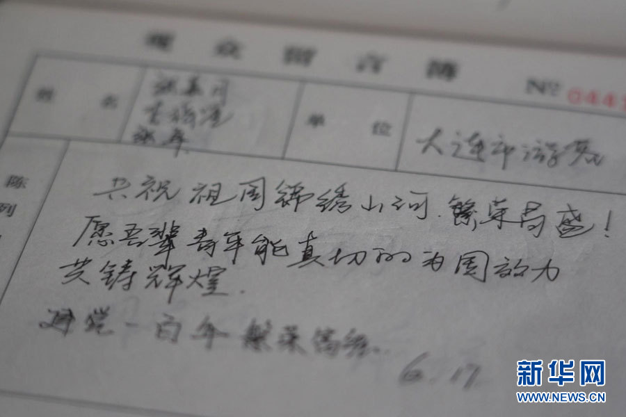 图为参观游客在“桂园”的观众留言簿上为祖国写下祝福。新华网 耿骏宇 摄 韩梦霖 文