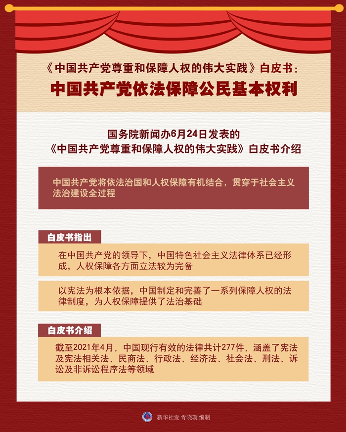 新华社北京6月24日电 国务院新闻办24日发表的《中国共产党尊重和保障人权的伟大实践》白皮书介绍,中国共产党将依法治国和人权保障有机结合,贯穿于社会主义法治建设全过程。