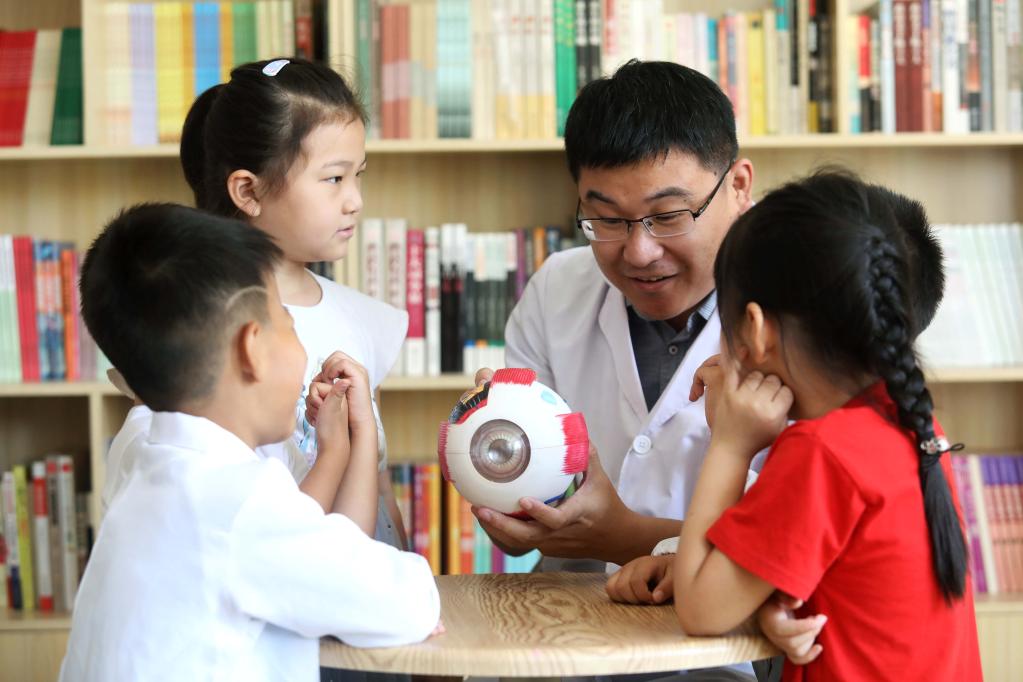 在石家庄市桥西区振头街道一个社区,眼科机构工作人员在为社区儿童讲解眼科知识。新华社发(梁子栋 摄)