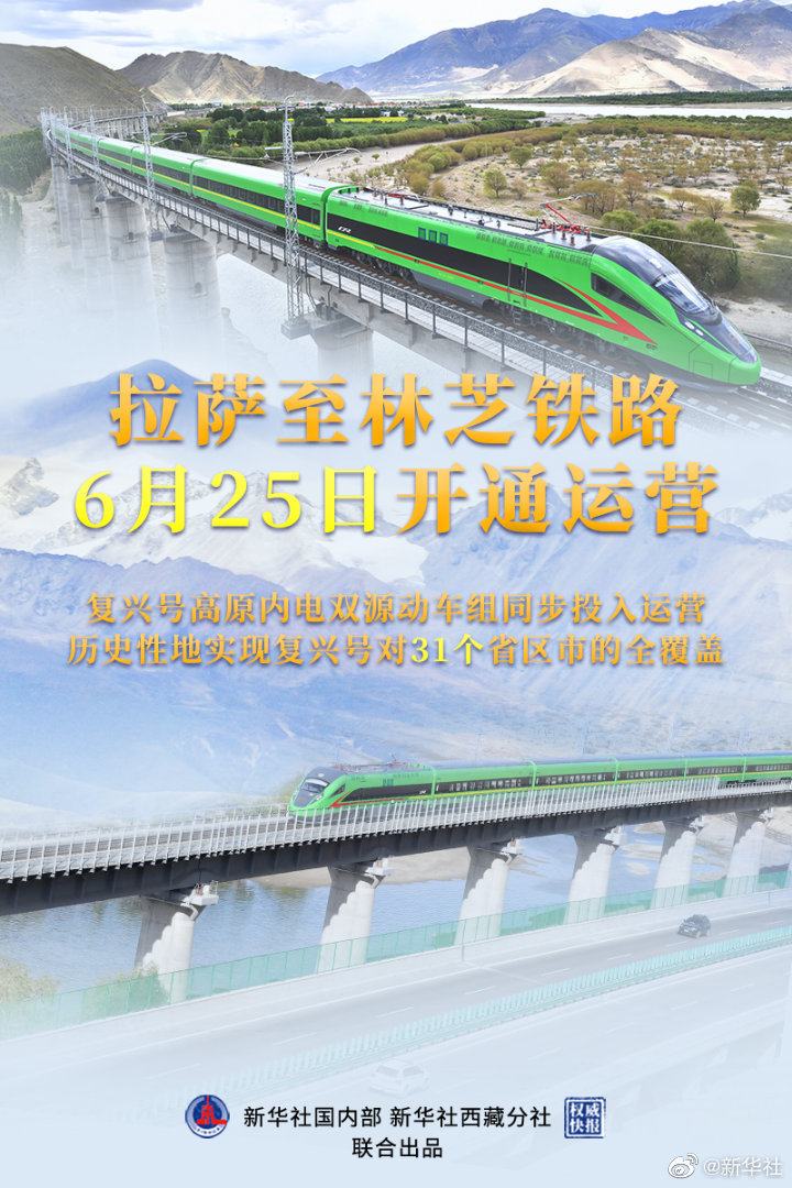 新华社北京6月24日电(记者樊曦、刘洪明)记者24日从中国国家铁路集团有限公司获悉,拉萨至林芝铁路将于6月25日开通运营,复兴号高原内电双源动车组同步投入运营,拉萨至山南、林芝最快1小时10分、3小时29分可达。