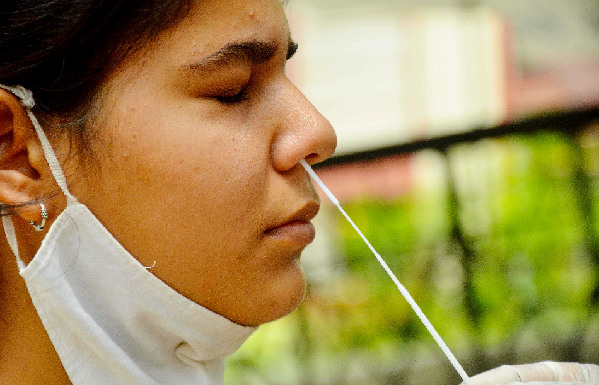 6月23日,一名女子在印度赫里德瓦尔接受新冠检测。新华社发