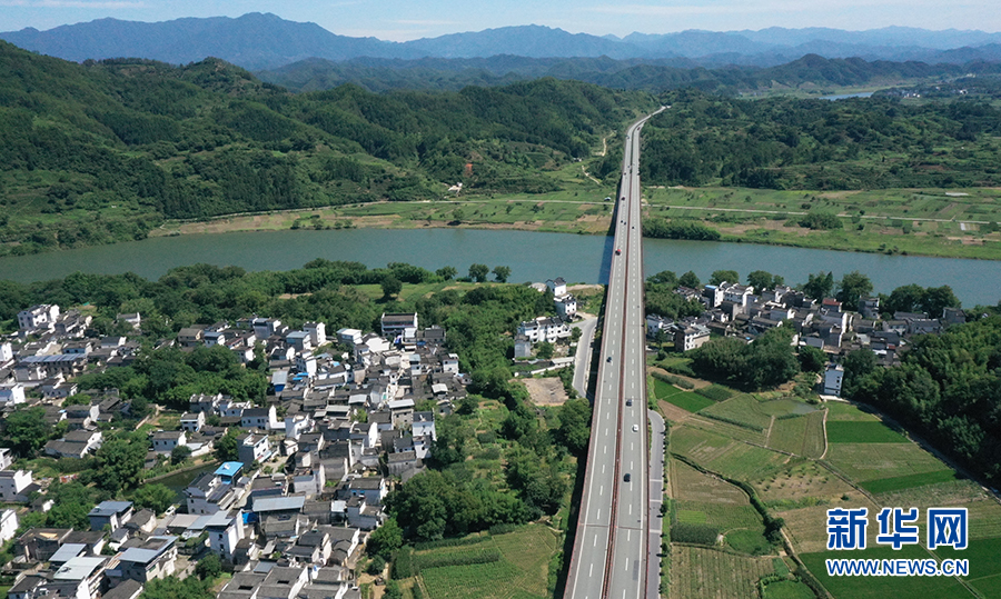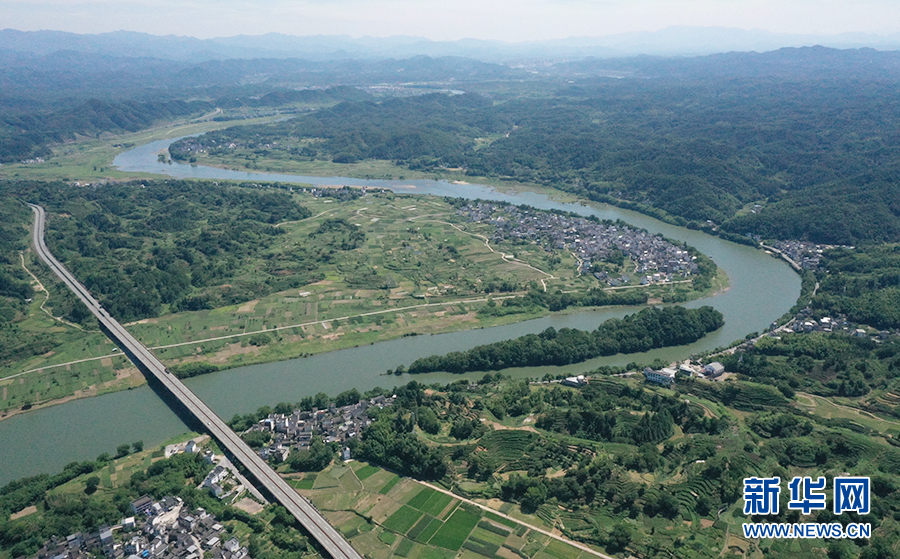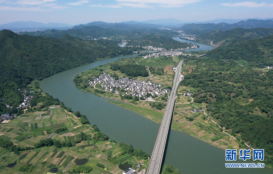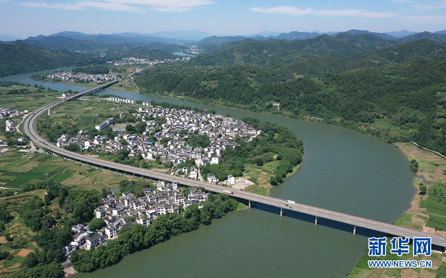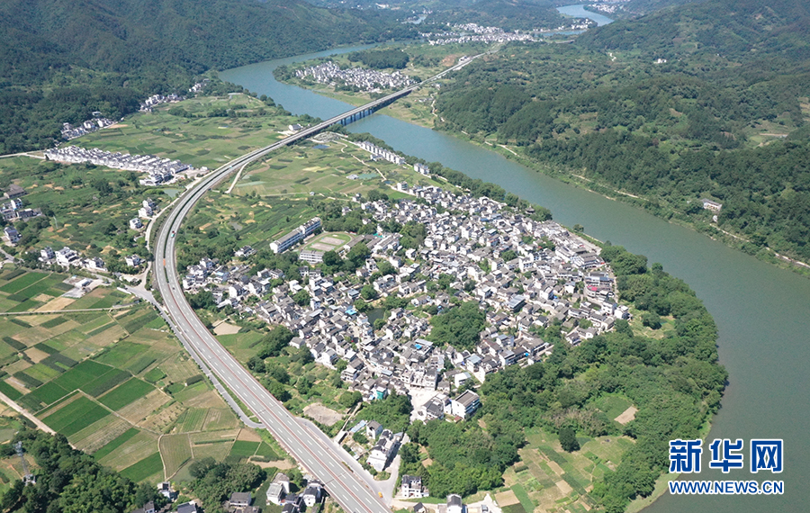 仲夏时节,地处安徽歙县城郊的雄村,青山环抱,新安江水傍村流淌。新华网发(潘成 摄)