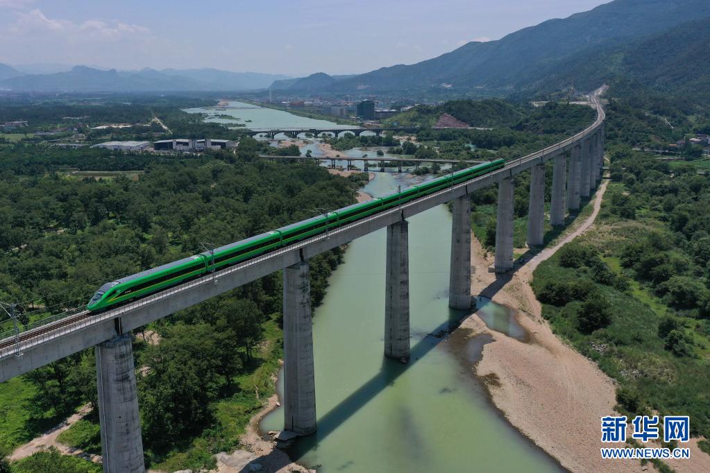6月25日,列车行驶在金台铁路台州市仙居县境内的永安溪特大桥上(无人机拍摄)。新华社记者 黄宗治 摄