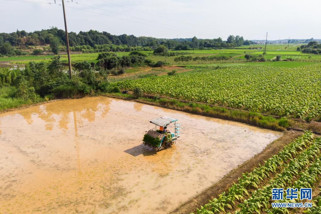 6月26日,湖南浏阳龙伏镇新开村村民驾驶插秧机在田间插秧(无人机照片)。