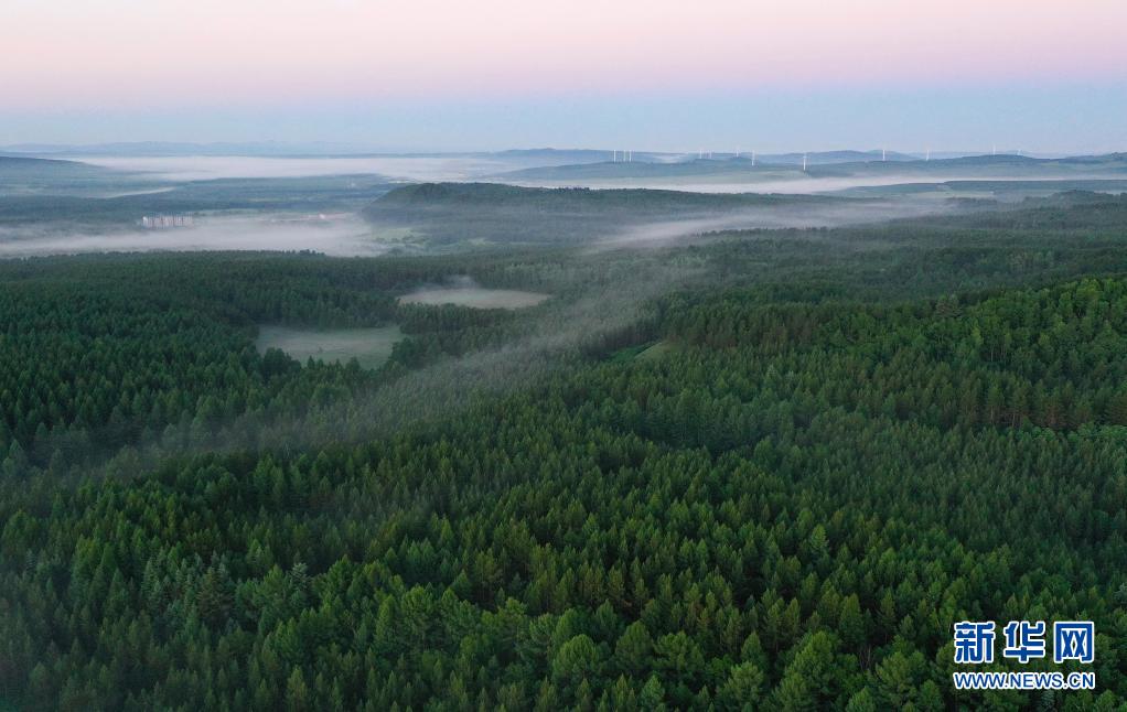 6月27日拍摄的塞罕坝国家森林公园晨景(无人机照片)。