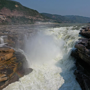 近日,受上游来水量减少影响,黄河晋陕峡谷水流变缓,水色变清,壶口瀑布再现“清流飞瀑”景观。