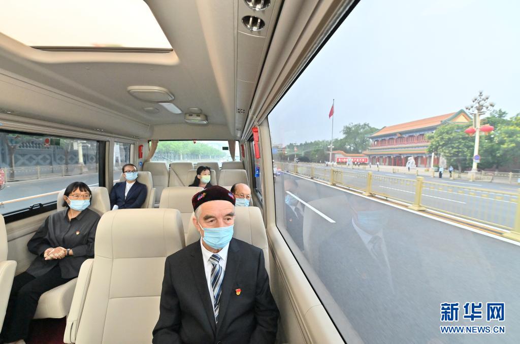 这是买买提江·吾买尔(前)、张桂梅(左一)、吴天一(右一)乘车前往人民大会堂。