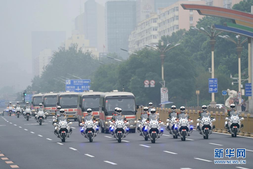 这是“七一勋章”获得者集体乘坐礼宾车从住地出发,由国宾护卫队护卫前往人民大会堂。