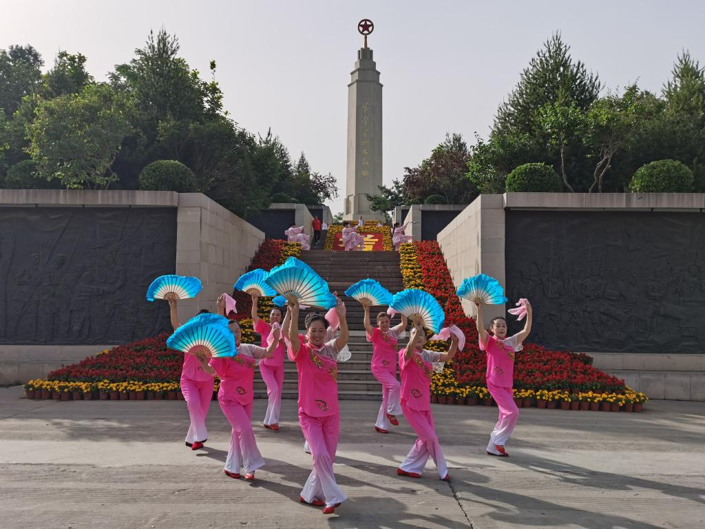 换过服装,打开音箱,赵艳华和队友们在西柏坡纪念碑前的广场上翩然起舞。这支业余舞蹈队成员平均年龄超过60岁,成团已经10余年,每年都会到这里排练和表演。