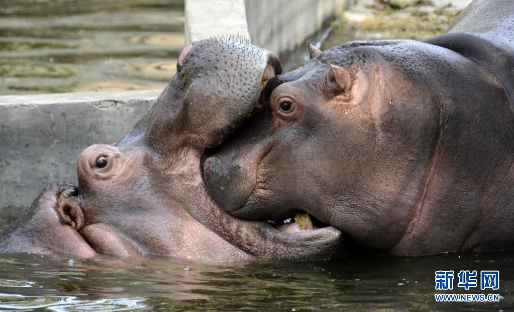 北京动物园河马馆内的河马在嬉戏(6月28日摄)。