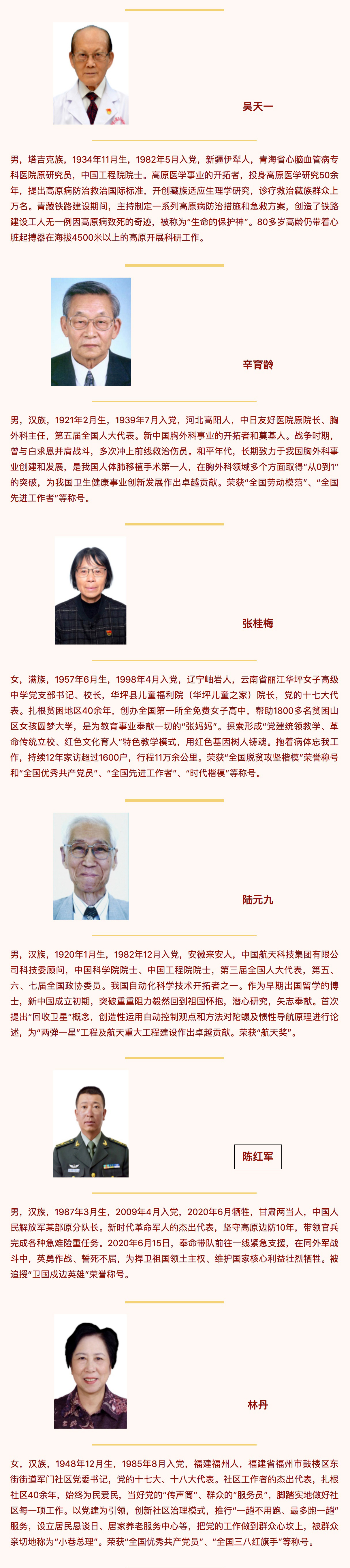 根据《中共中央关于授予“七一勋章”的决定》,授予29名同志“七一勋章”。 以下是“七一勋章”获得者简介: