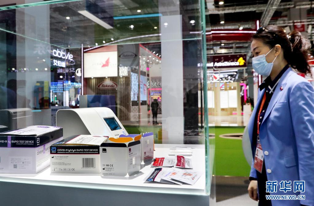在第三届中国国际进口博览会公共卫生防疫专区,参观者观看雅培展示的便于携带且适用于大规模检测的新冠病毒快速抗原检测试剂和产品(2020年11月5日摄)。新华社记者 刘颖 摄