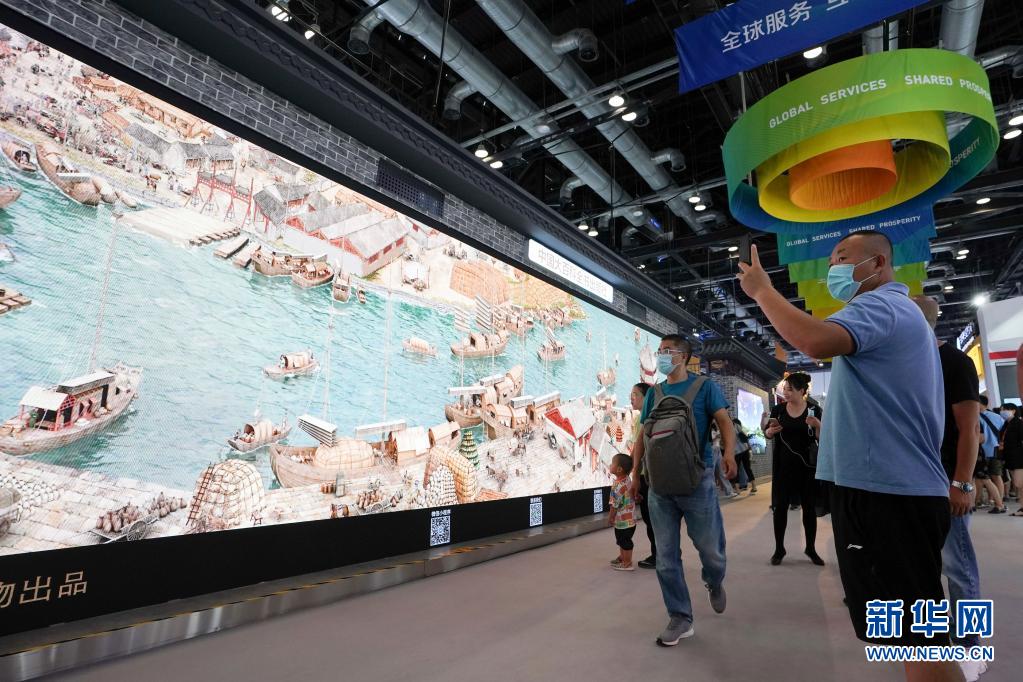 在2020年中国国际服务贸易交易会综合展区,参观者在参观展出的《穿越时空的大运河》数字影像(2020年9月6日摄)。新华社记者 鞠焕宗 摄