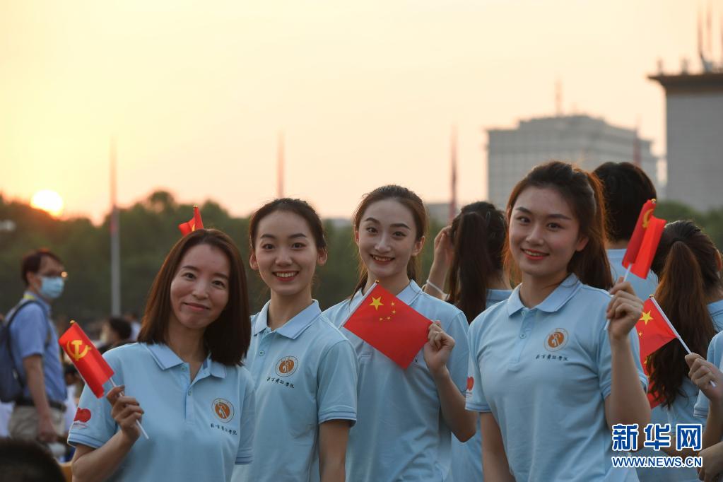 7月1日,庆祝中国共产党成立100周年大会将在北京天安门广场隆重举行。这是清晨,几名观众在日出时合影。