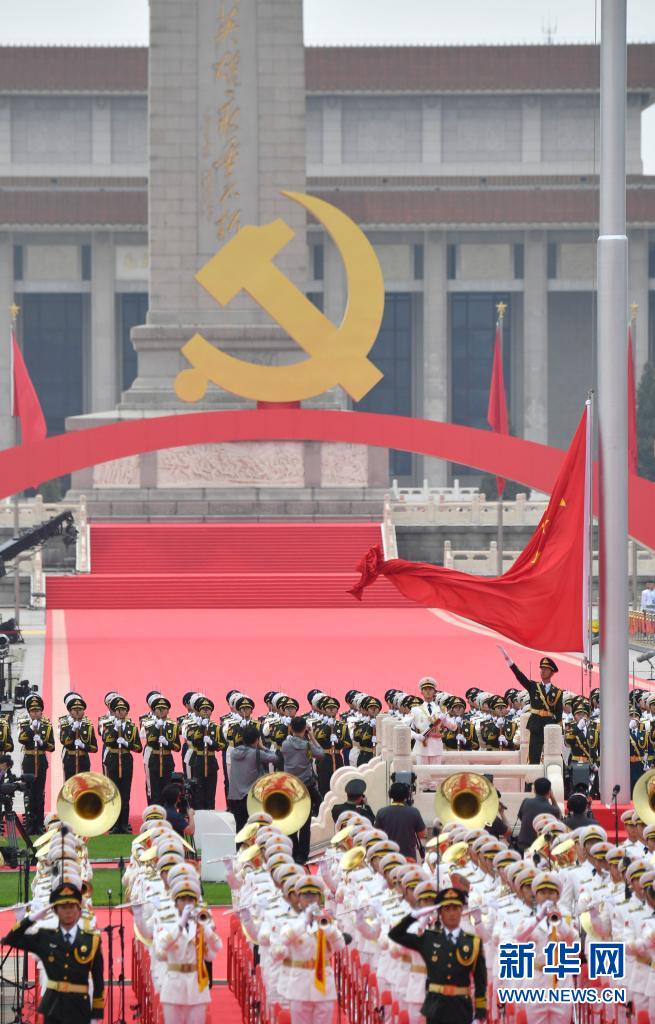 7月1日上午,庆祝中国共产党成立100周年大会在北京天安门广场隆重举行。这是升国旗仪式。