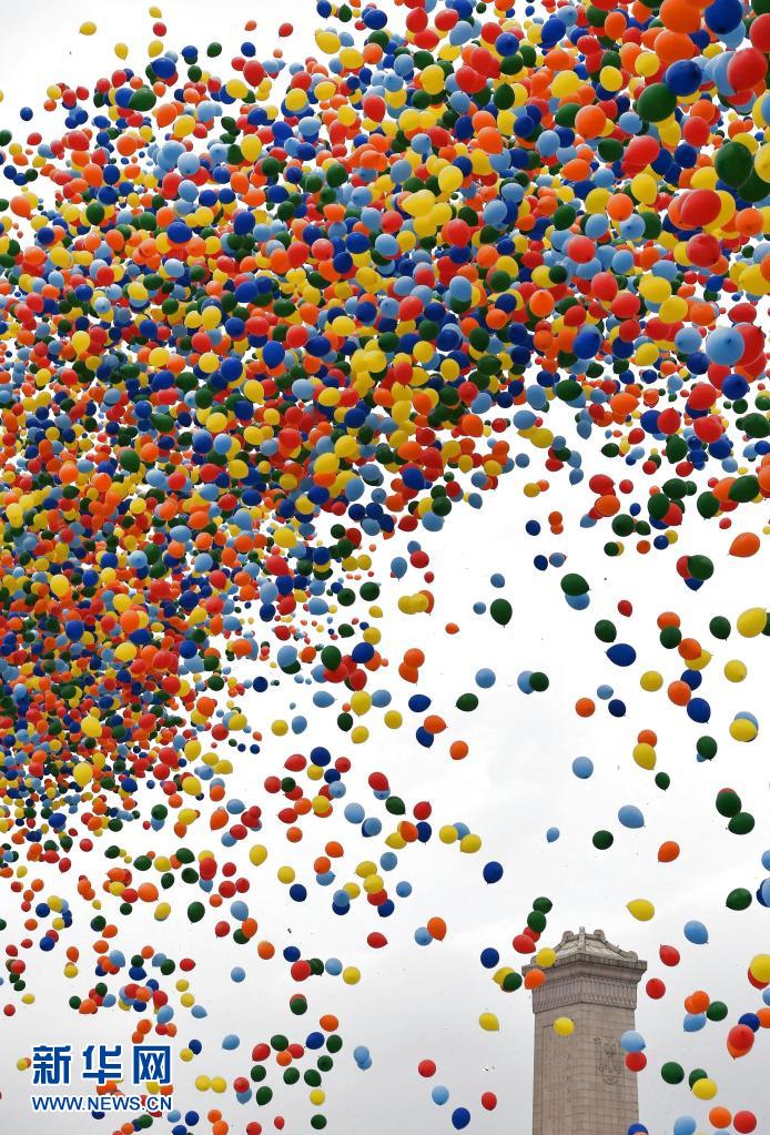 7月1日上午,庆祝中国共产党成立100周年大会在北京天安门广场隆重举行。这是庆祝大会现场放飞气球。