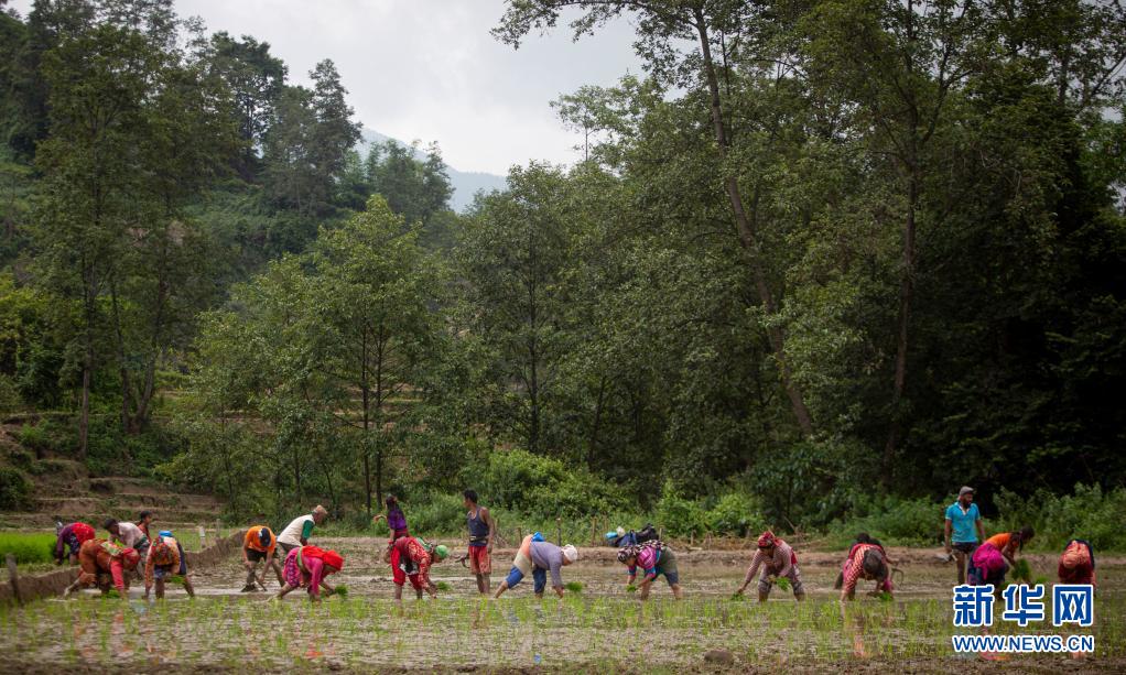 6月29日,农民在尼泊尔中部勒利德布尔附近的稻田里插秧。
