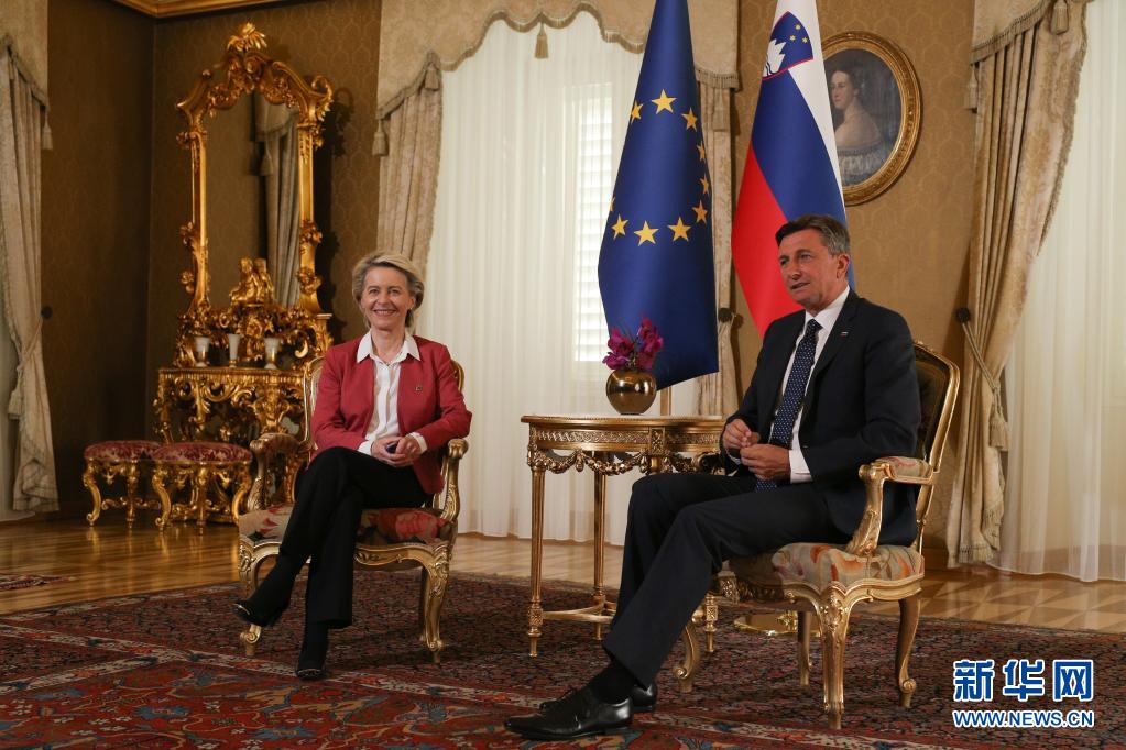 7月1日,斯洛文尼亚总统帕霍尔(右)在布尔多与欧盟委员会主席冯德莱恩会面。新华社发(泽利科·斯特凡尼奇摄)
