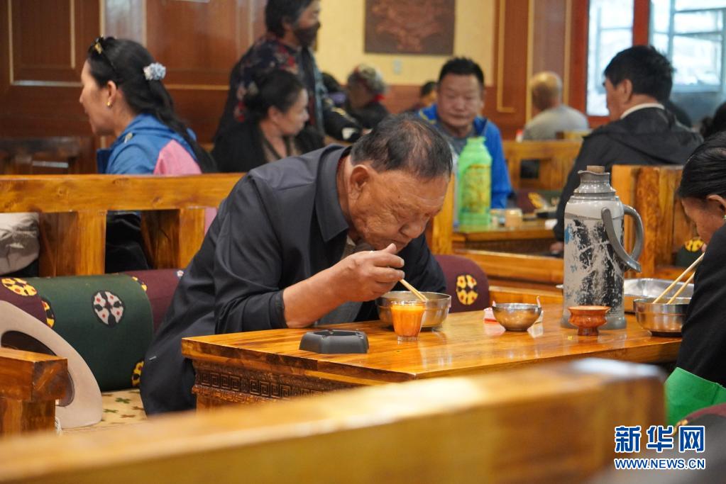 在位于拉萨市中心八廓街里的桑曲茶馆,客人在吃藏面(6月29日摄)。新华社记者 王泽昊 摄