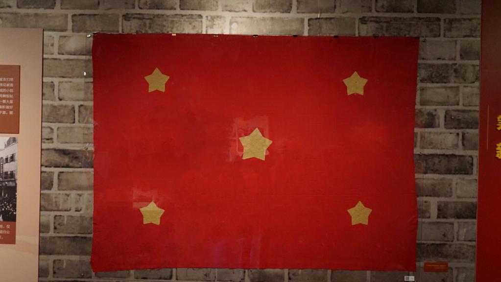 此外,有两面红旗虽不是首次向公众亮相,但也吸引了观众的目光。原藏于重庆红岩革命历史博物馆的一面红旗,是由《红岩》作者罗广斌在白公馆监狱中和狱友一起制作的。他们凭借着自己对五星红旗的想象,将草纸裁出的五角星用米粒粘在被面正中,四颗小星分布在四角,象征中国人民紧紧地团结在中国共产党的周围。
