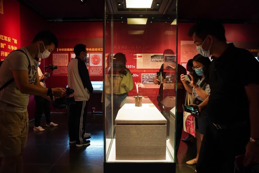 主办方介绍,展览分为“中国共产党的创建和投身大革命的洪流”“掀起土地革命的风暴”“全民族抗日战争的中流砥柱”“夺取新民主主义革命的全国性胜利”四部分,采用实体文物、图片视频、油画雕塑、VR等展示手段,重点挖掘21组革命文物背后蕴含的故事,体现中国共产党红色征程背后的革命精神。
