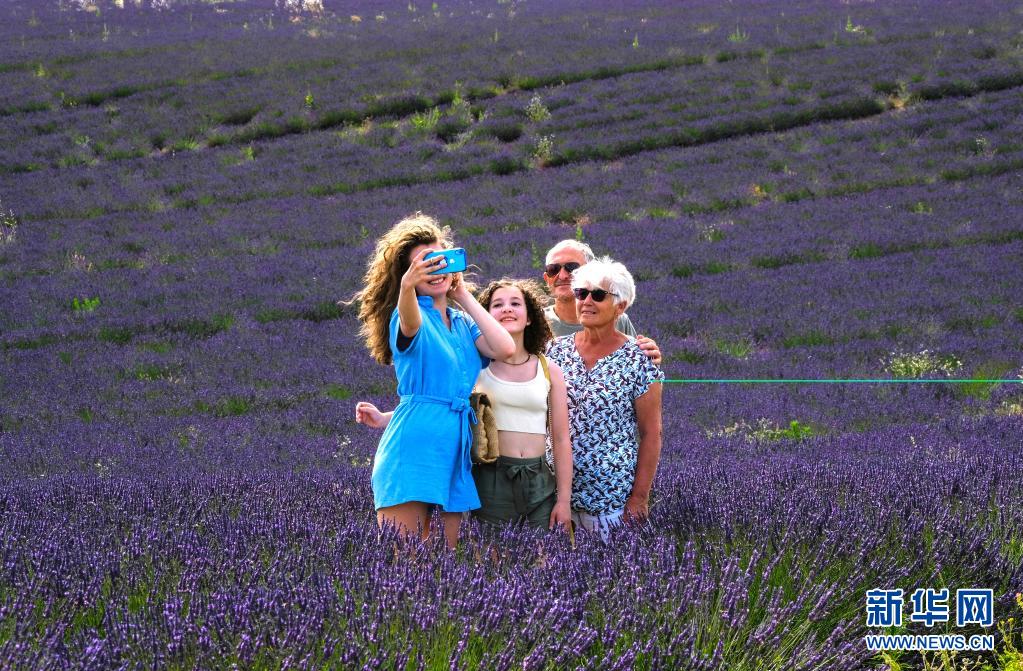 7月1日,人们在法国南部瓦朗索勒薰衣草花田里拍照。