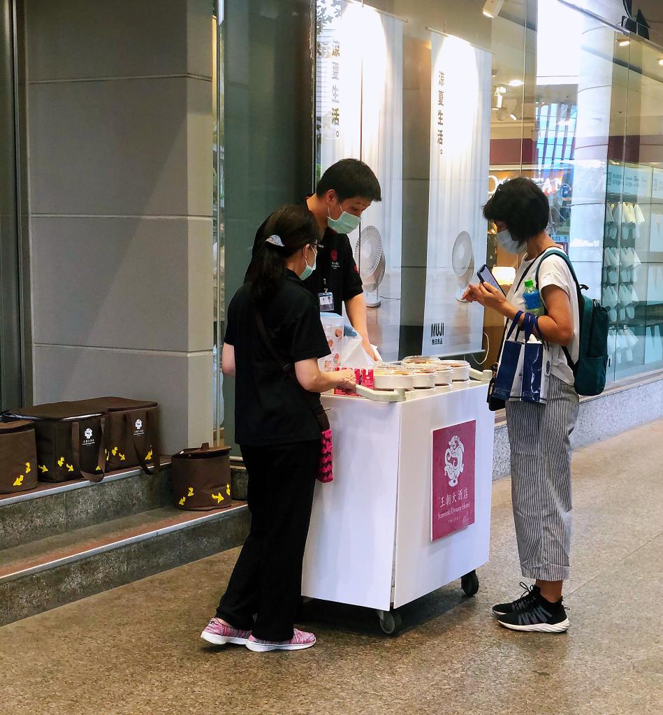 疫情三级警戒下,餐厅不可内用,只能外送或外带。台北微风南京商场附近,民众在挑选外带便当。新华社记者 姜婷婷 摄