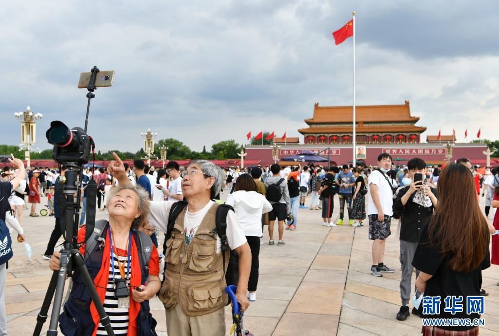 庆祝中国共产党成立100周年大会结束后,天安门广场迅速完成转换施工。7月2日恢复对外开放后,天安门广场庆祝景观吸引了大批游客前往拍照。据悉,天安门广场保留的景观将开放到7月15日。