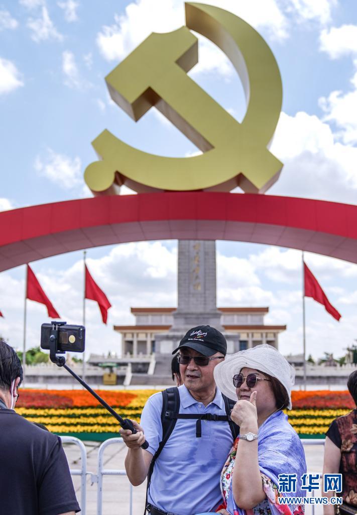 庆祝中国共产党成立100周年大会结束后,天安门广场迅速完成转换施工。7月2日恢复对外开放后,天安门广场庆祝景观吸引了大批游客前往拍照。据悉,天安门广场保留的景观将开放到7月15日。