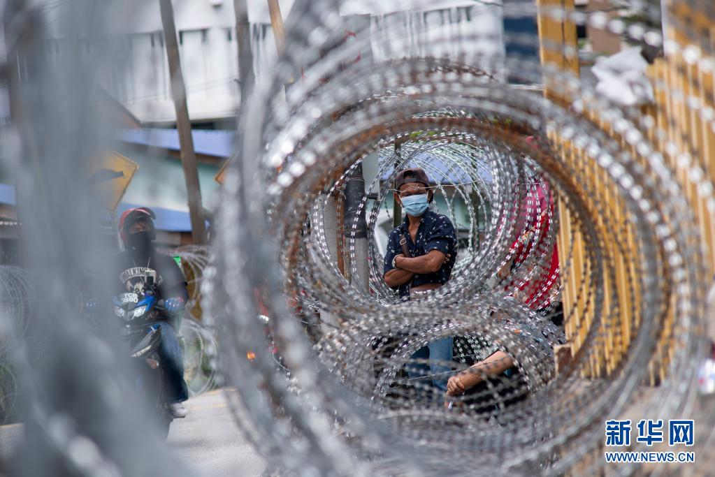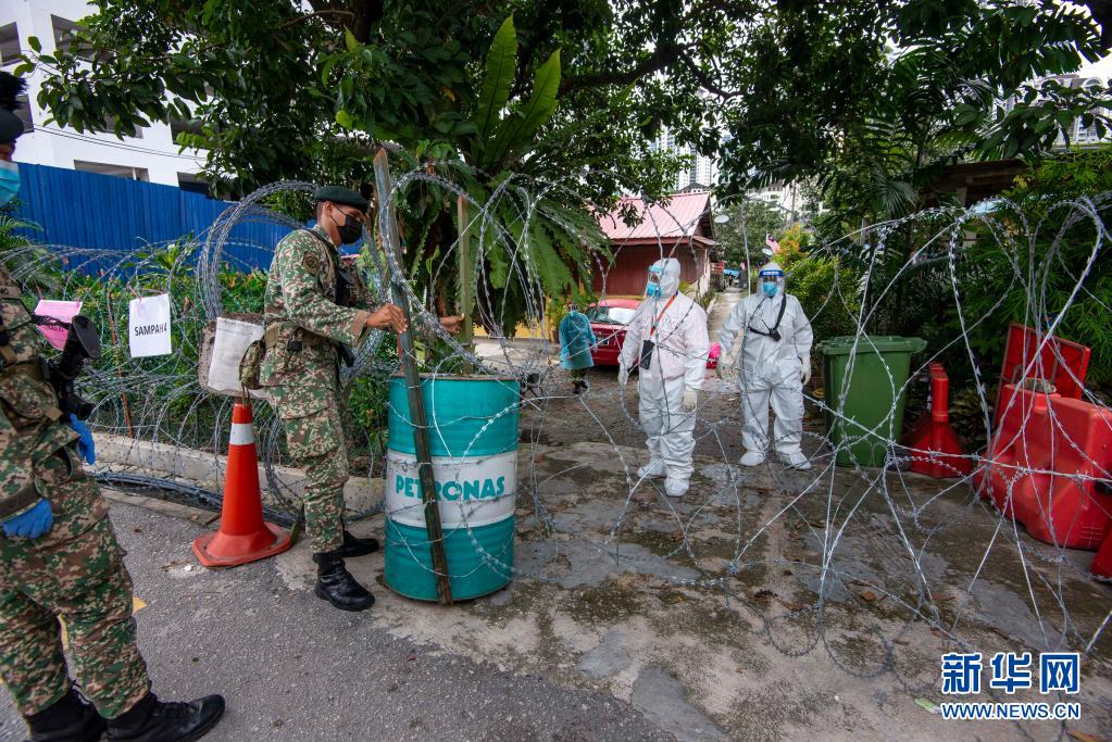 7月3日,士兵在马来西亚吉隆坡一处实施“加强行动管制令”的地区执勤。新华社发(张纹综摄)