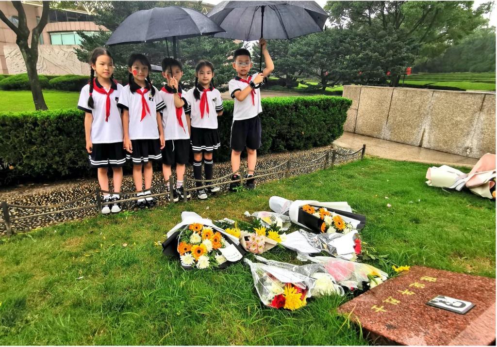 7月2日,5名少先队员冒雨来到上海龙华烈士陵园陈延年烈士墓前追思先烈。 新华网罗沛鹏 摄