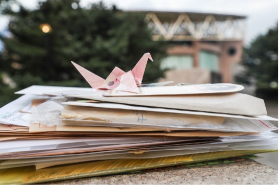 陈延年、陈乔年、赵世炎烈士墓前的信纸、千纸鹤。 新华网吴恺 摄
