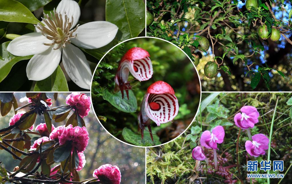 这张拼版照片显示的是高黎贡山国家级自然保护区的部分野生植物,左上为长蕊木兰,左下为大树杜鹃,中间为大理铠兰,右上为保山茜,右下为矮马先蒿(资料照片)。新华社发(高黎贡山国家级自然保护区保山管护局供图)