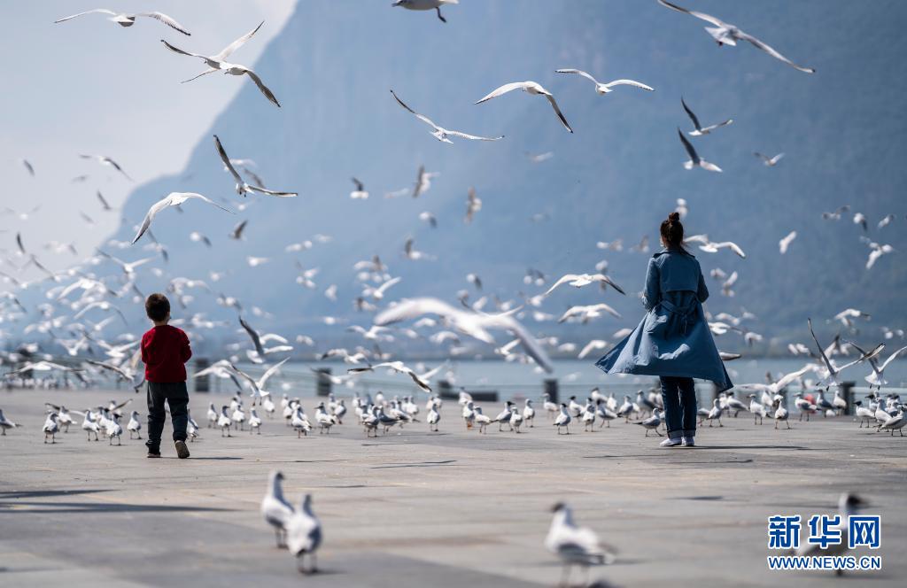市民在昆明市草海大坝观赏红嘴鸥(资料照片)。新华社记者 江文耀 摄